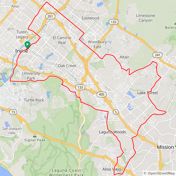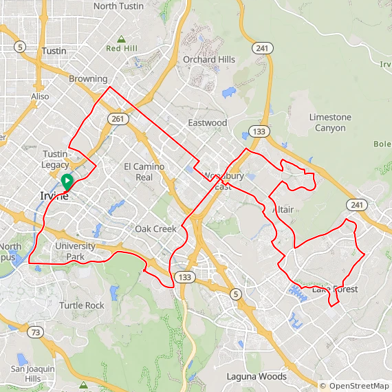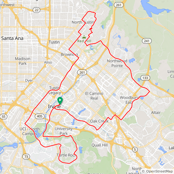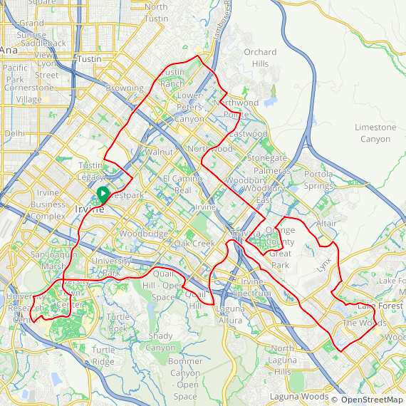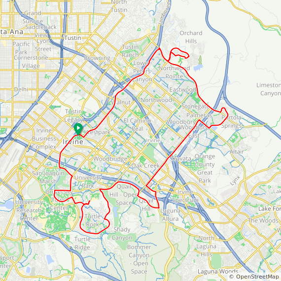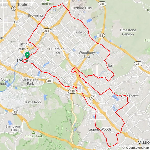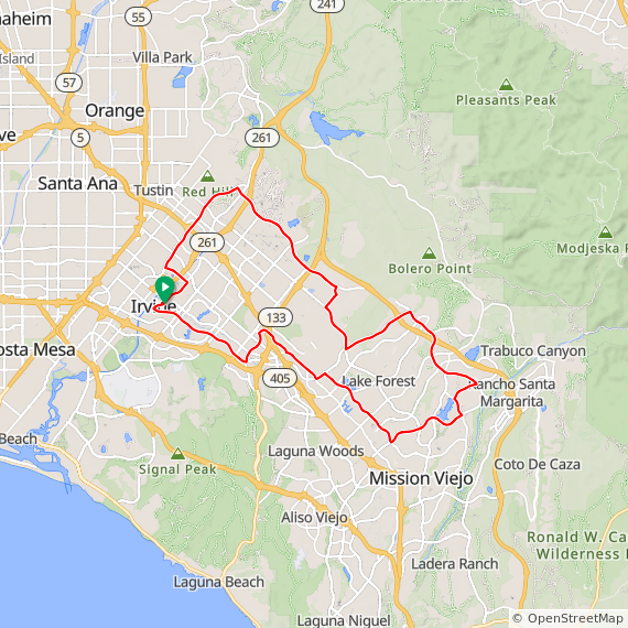 40 Mile hilly ride thru Tustin Legacy, Woodbury East, Great Park, Baker Ranch, Lake Forest, Laguna Hills, Aliso Viejo, Laguna Woods, Quail Hill, University Park and Irvine. 1600 feet of elevation gain.