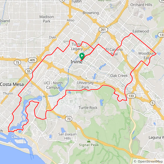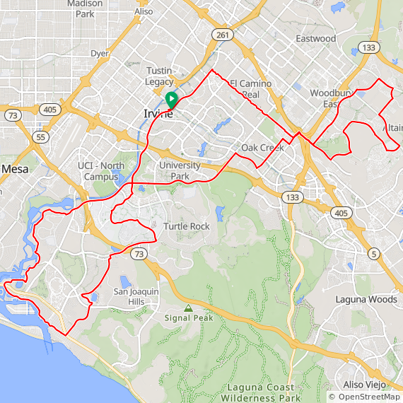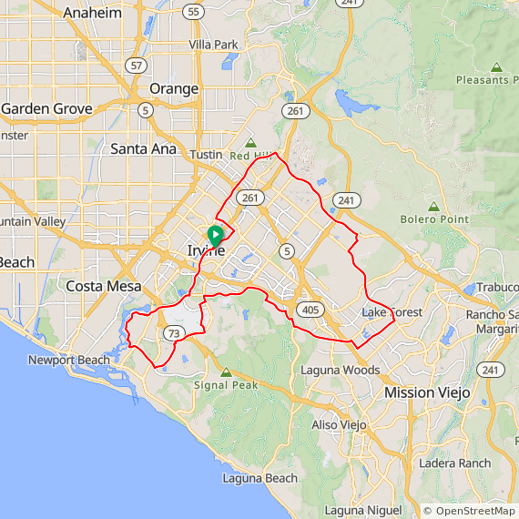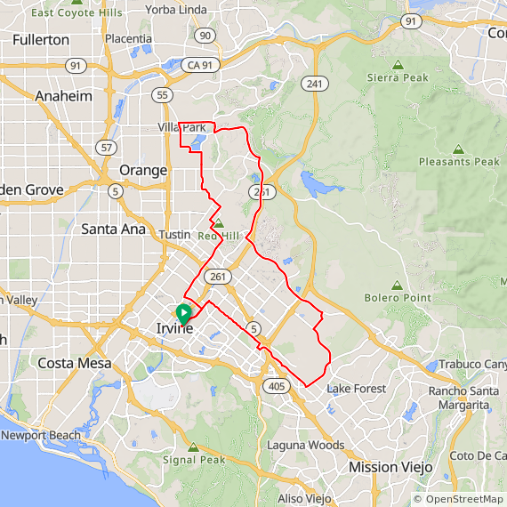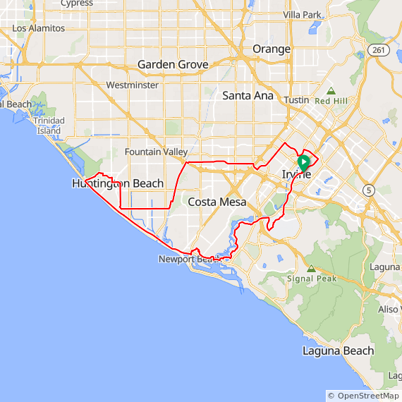 39 Mile ride thru Irvine, UCI, Bonita Canyon, San Miguel, Corona Del Mar, Back Bay, University Park, Valley Oak, Portola Springs, Great Park and Walnut Trail. 1200 feet of elevation gain.