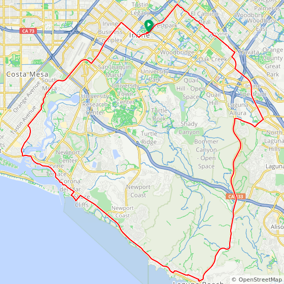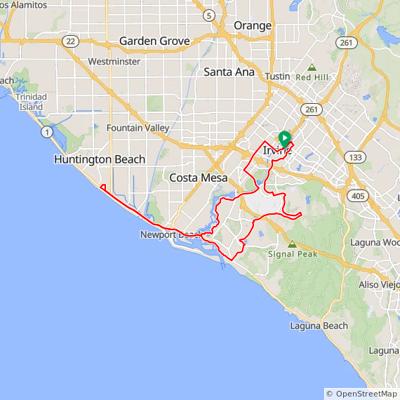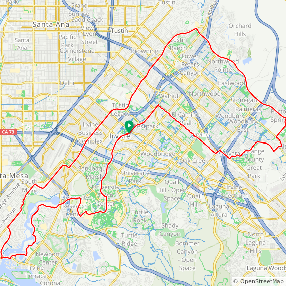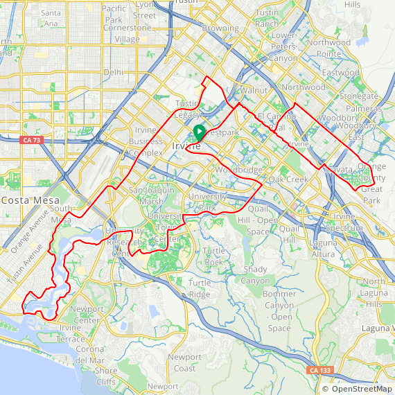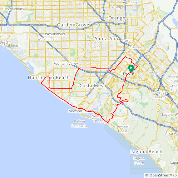 40 Mile ride thru Westpark, UCI Town Center, Turtle Rock, Shady Canyon, Bonita Canyon, San Miguel, Corona Del Mar, Newport Beach, Huntington Beach, Back Bay, UCI North Campus, Irvine Business Complex and Irvine.