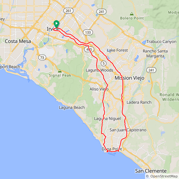 44 mile ride thru Irvine, Irvine Spectrum, Laguna Hills, Laguna Woods, Aliso Viejo, Laguna Niguel, Monarch Beach, Dana Point Harbor, San Juan Capistrano, Mission Viejo, Lake Forest and Woodbridge.