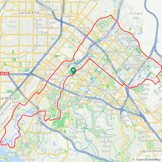 39 Mile ride thru Tustin Legacy, Santa Ana Heights, Newport Beach, Back Bay, East Bluff, UCI, University Town Center, University Park, Quail Hill, East Irvine, Great Park, Woodbury and Irvine.