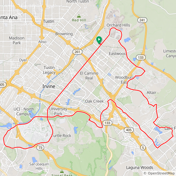 39 Mile ride thru Orchard Hills, Portola Springs, Great Park, Lake Forest, Irvine Spectrum, Quail Hill, University Park, Eastbluff, Bonita Canyon and Irvine.