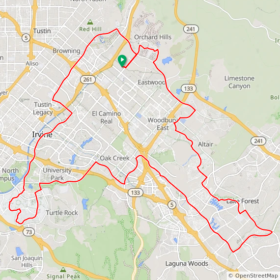 43 Mile ride thru Orchard Hills, Portola Springs, Great Park, Lake Forest, Irvine Spectrum, University Park, UCI, University Town Center, Irvine and Tustin Ranch. 1600 feet of elevation gain.