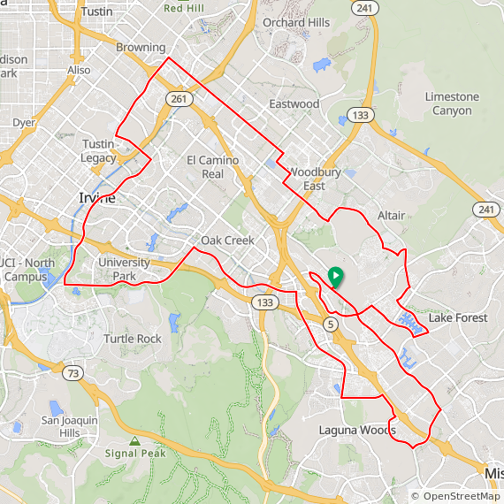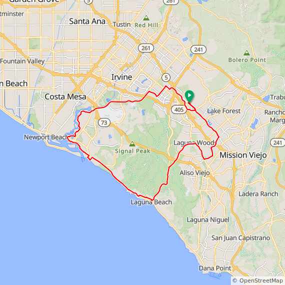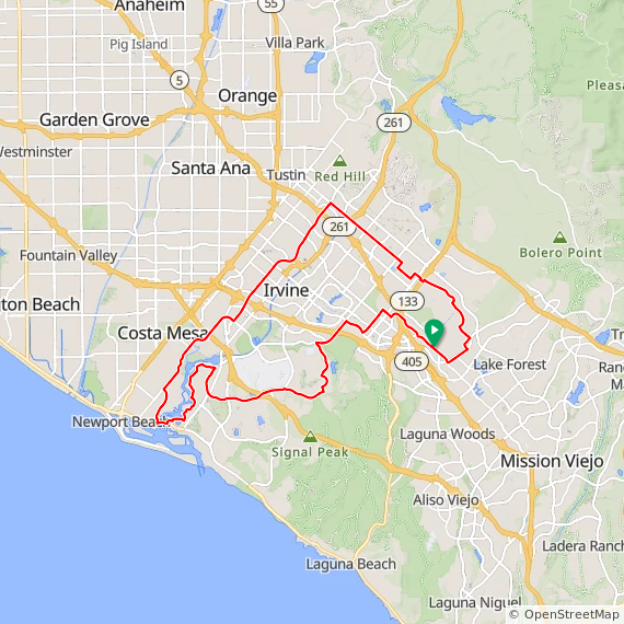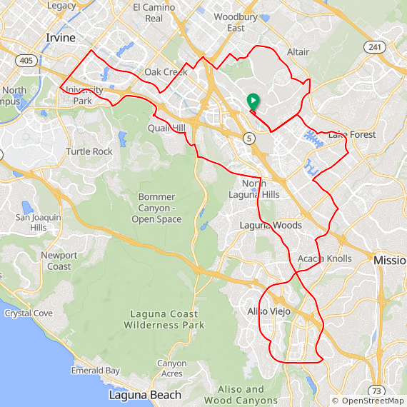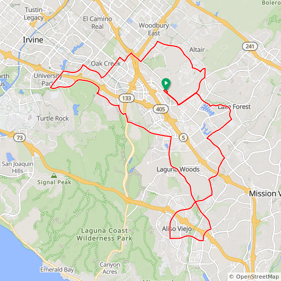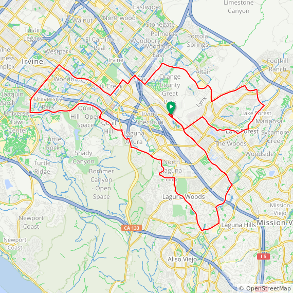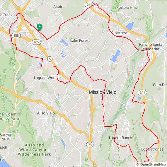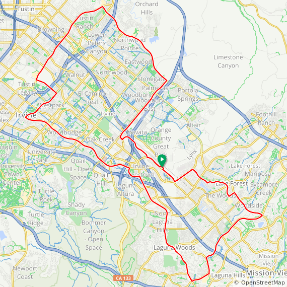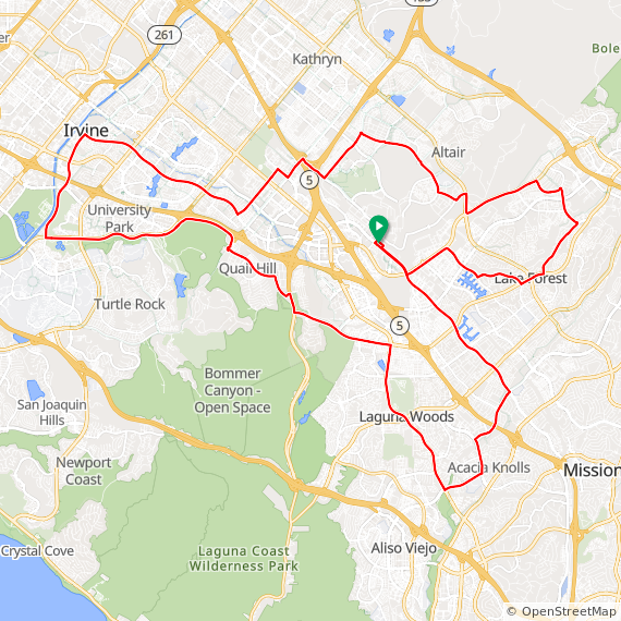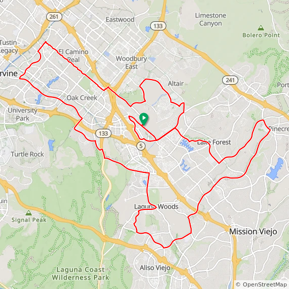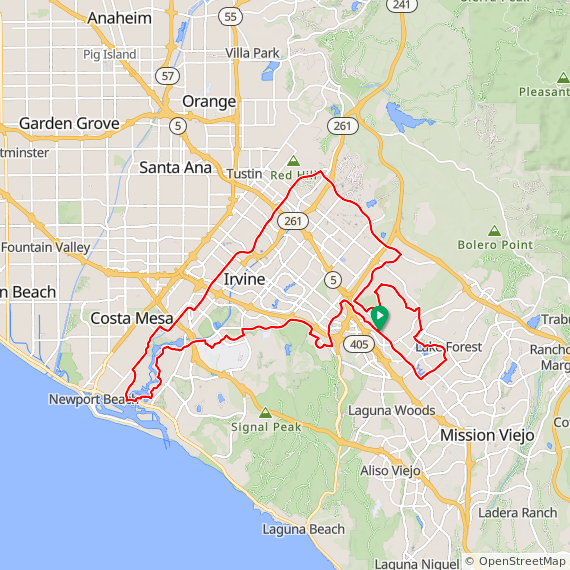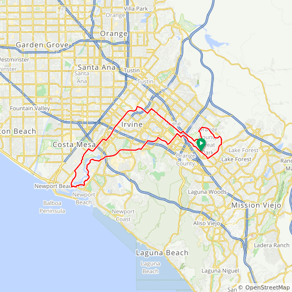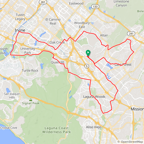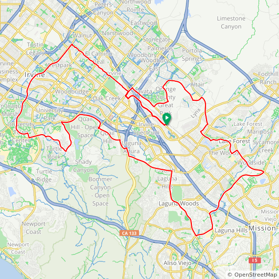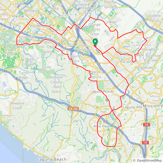35 Mile ride thru Baker Ranch, Mission Viejo, Lake Forest, Laguna Hills, Laguna Woods, Laguna Canyon, Quail Hill, University Park, Woodbridge, Oak Creek and Irvine Spectrum. 1600 feet of elevation gain.