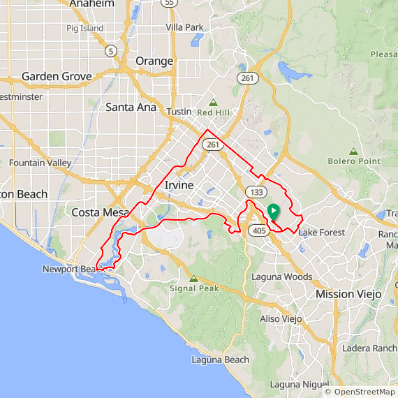 39 Mile ride thru Lake Forest, Laguna Hills, Laguna Woods, Laguna Beach, Corona Del Mar, Back Bay, University Park, Oak Creek, East Irvine and Irvine Spectrum. 1400 feet of elevation gain.