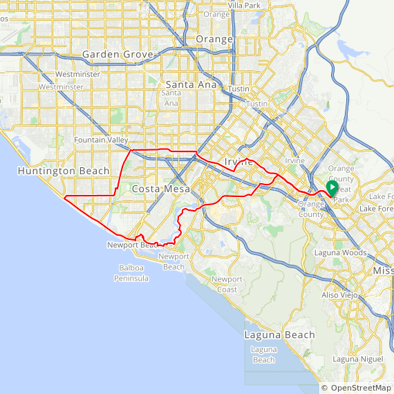 39 Mile flat ride thru Irvine, Costa Mesa, Huntington Beach and Newport Beach. 600 feet of elevation gain.