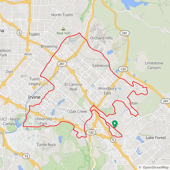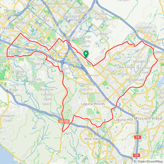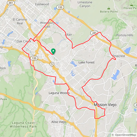 35 Mile ride thru Baker Ranch, Mission Viejo, Lake Forest, Laguna Hills, Laguna Woods, Laguna Canyon, Quail Hill, University Park, Woodbridge, Oak Creek and Irvine Spectrum.  1600 feet of elevation gain.