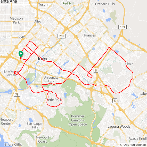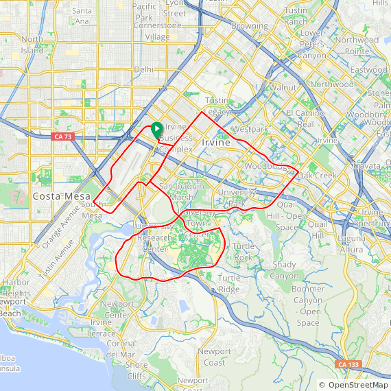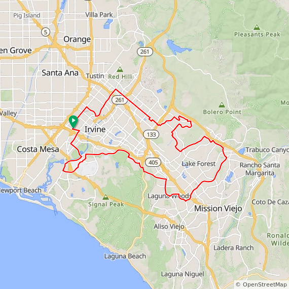 48 Mile ride thru Tustin Legacy, Northwood, Woodbury, Great Park, Portola Springs, Baker Ranch, Mission Viejo, Lake Forest, Laguna Woods, North Laguna Hills, Quail Hill, University Park, University Town Center, UCI, Newport Beach, East Bluff, UCI North Campus and Irvine Business Campus. 1900 feet of elevation gain.