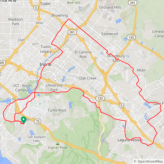 40 Mile ride thru Newport Beach, UCI, Irvine, Tustin Legacy, Northwood, Woodbury, Great Park, Lake Forest, Laguna Woods, North Laguna Hills, Quail Hill, University Park, East Bluff and back up Bonita Canyon. 1300 feet of elevation gain.