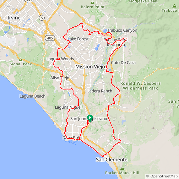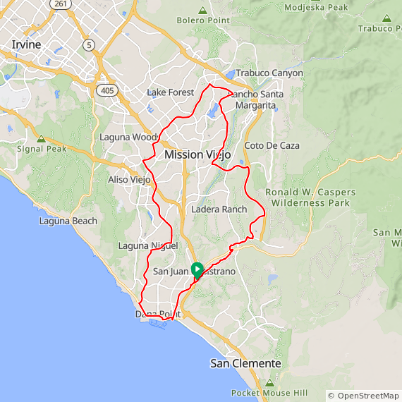 65 mile hilly ride thru Dana Point, Laguna Niguel, Aliso Viejo, Laguna Woods, Lake Forest, Baker Ranch, Melinda Heights, Rancho Santa Margarita, Las Flores, Los Patrones, Rancho Mission Viejo, up La Pata to San Clemente and Doheny. 4000 feet of elevation gain.